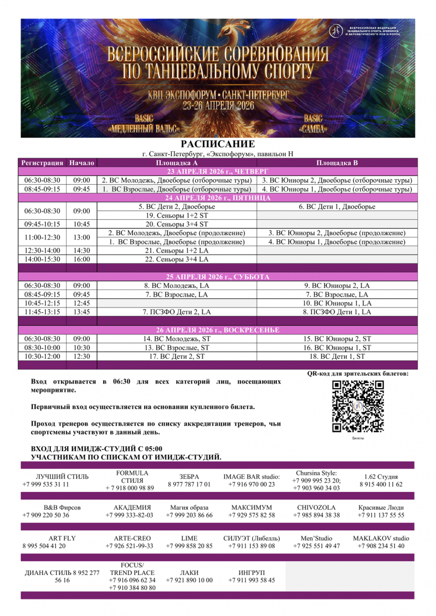 С 23 по 26 апреля 2026 года в Санкт-Петербурге, в КВЦ «Экспофорум» (павильон Н), проходят всероссийские соревнования по танцевальному спорту 💃🕺